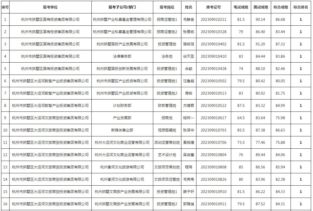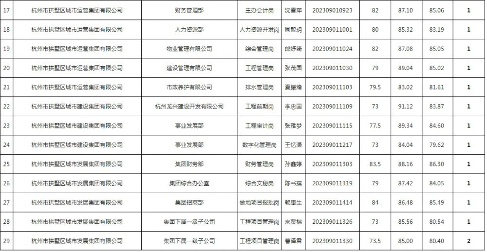 根據《2023年杭州市拱墅區國有企業公開招聘工作人員公告》有關規定,現將入圍體檢人員名單進行公示,體檢時間為2023年11月2日(周四)上午,《體檢通知書》由招聘單位通知考生領取,體檢具體要求詳見《體檢通知書》,考生參加體檢時須隨帶本人身份證及《體檢通知書》