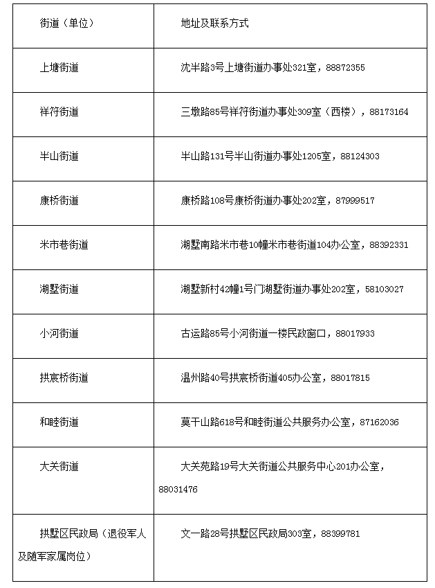 地點:各報考崗位所在街道。定向招聘優秀網格員崗位在相應街道領取;定向招聘退役軍人及隨軍家屬崗位在拱墅區民政局領取。領取地址及聯系方式具體如下: