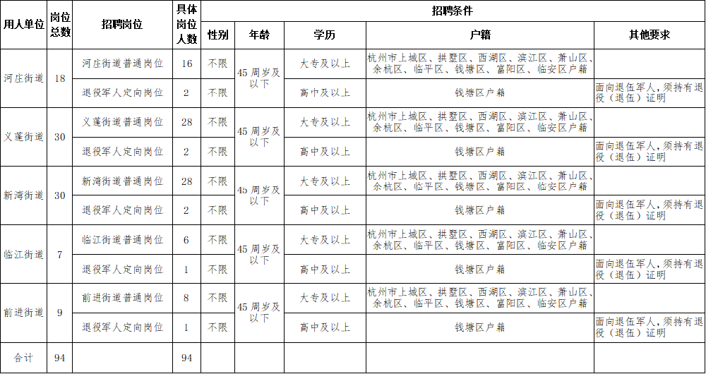 本次共招聘農(nóng)村專職網(wǎng)格員94名,其中普通崗位招聘86人,退役軍人崗位招聘8人。具體招聘崗位、人數(shù)及相關(guān)條件詳見《錢塘區(qū)2023年度公開招聘農(nóng)村專職網(wǎng)格員崗位一覽表》(附件1),有意者可按規(guī)定條件和程序報考。