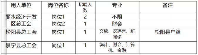 麗水全市招聘5名職業化工會工作者,分別為:麗水經濟開發區總工會3名,松陽縣下屬鄉鎮(街道)總工會1名,景寧縣下屬鄉鎮(街道)總工會1名。